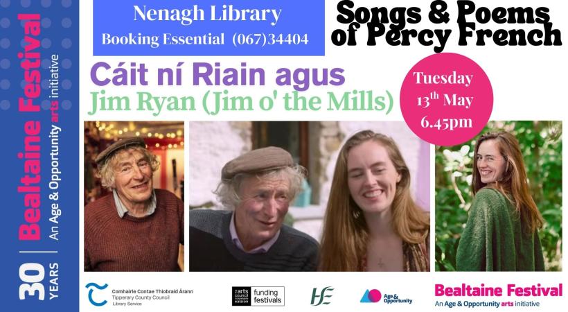 Get ready for a delightful evening celebrating the wit and charm of Percy French! Join the wonderful Cáit Ní Riain and the legendary Jim Ryan (Jim O’ the Mills) as they explore his beloved songs, stories, and life. If you’ve ever heard Jim sing classics like “The Darling Girl from Clare,” “Whistling Phil McHugh,” or “Cutting the corn in Creeslough” at their Upperchurch sessions, you know you’re in for a treat! Discover the masterful lyricism and enchanting melodies of Percy French. Book your FREE place now at Nenagh Library or call us on (067) 34404. Don’t miss this special celebration of Irish culture!